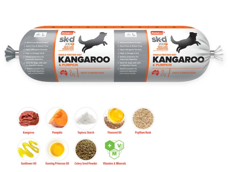 Kangaroo, potato starch, vitamins, minerals, flaxseed oil, psyllium husk, sunflower oil, evening primrose oil, salt, natural digestive enzymes, celery seed powder.